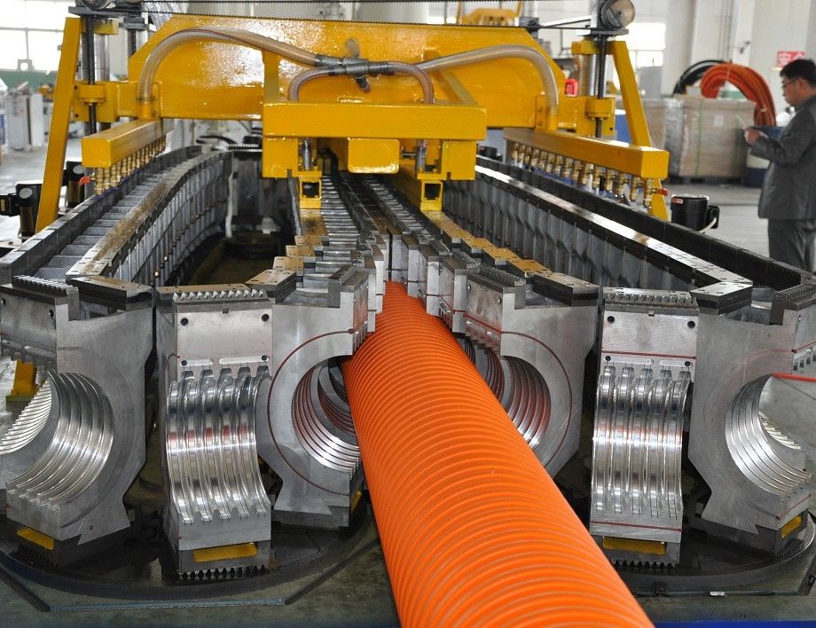 SBG250 (ID90 মিমি - 250 মিমি) ডাবল ওয়াল rugেউখেলান পাইপ লাইন গ্রহণ করে দুটি একক স্ক্রু extruders, ডাবল চ্যানেল কাঠামো, নাইট্রাইডিং পালিশ চিকিত্সা মাথা মারা